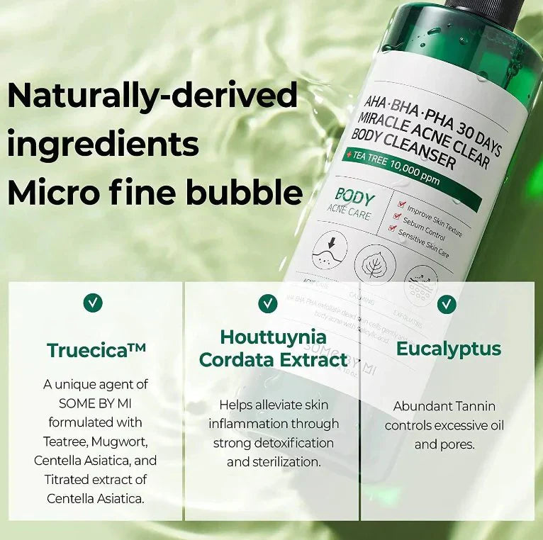 KEY INGREDIENTS: The formula features SOME BY MI's exclusive Truecica™, Eucalyptus, and Houttuynia Cordata Extract, which help soothe the skin and tighten pores. The use of natural cleansing surfactants ensures that sensitive skin is protected while impurities are effectively removed. Additionally, it is designed to keep the skin moisturized after showering.